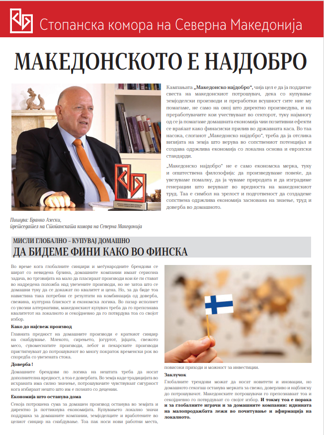 Излезе во јавност флаерот на Стопанска комора со наслов „Македонско најдобро“, со ставови изнесени од претседателот Бранко Азески чија цел е да ја подигне свеста на македонскиот потрошувач, дека со купување земјоделски производи и преработки всушност сите ние му помагаме, не само на оној што директно произведува, и на преработувачите кои учествуваат во секторот, туку најмногу од се ја помагаме домашната економија чии позитивни ефекти се враќаат како финасиски прилив во државната каса.