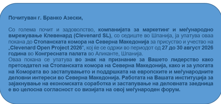 На адреса на Стопанската комора и претседателот Азески стигна допис од компанијата за маркетинг и меѓународно вмрежување Клевенард (Clevenard SL), со седиште во Шпанија, која доставува покана СКСМ да присуствува и да земе активно учество на „Clevenard Open Project 2026“, кој ќе се одржи во периодот од 27 до 30 август 2026 година во Конгресната палата воАликанте, Шпанија.