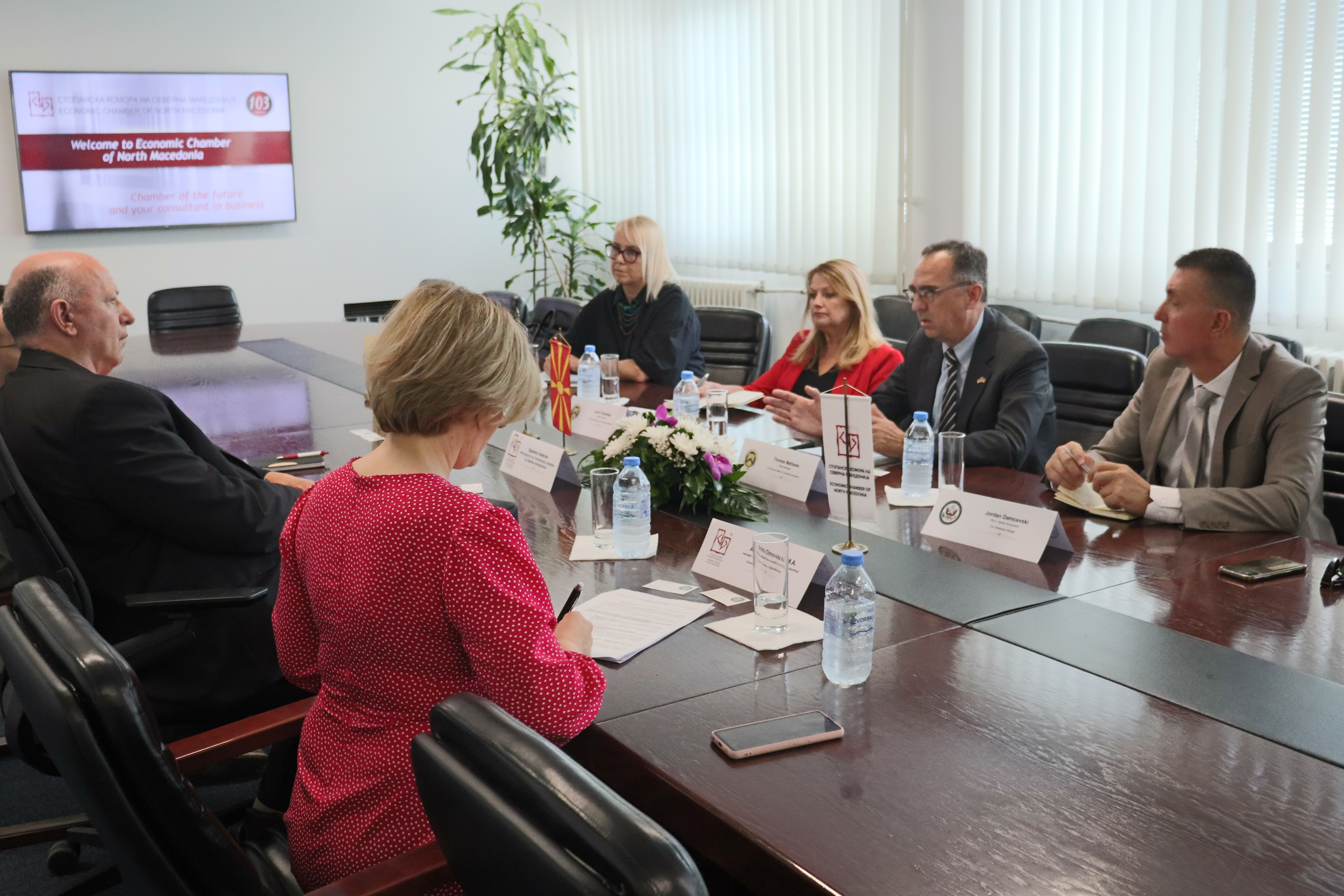 Today, at the premises of the Economic Chamber of North Macedonia, a working meeting was held between the Chamber’s President, Mr. Branko Azeski, and representatives from the U.S. Department of the Treasury – Mr. Thomas Matthew and Ms. Laura Hostelley, revenue policy advisors at the Department.