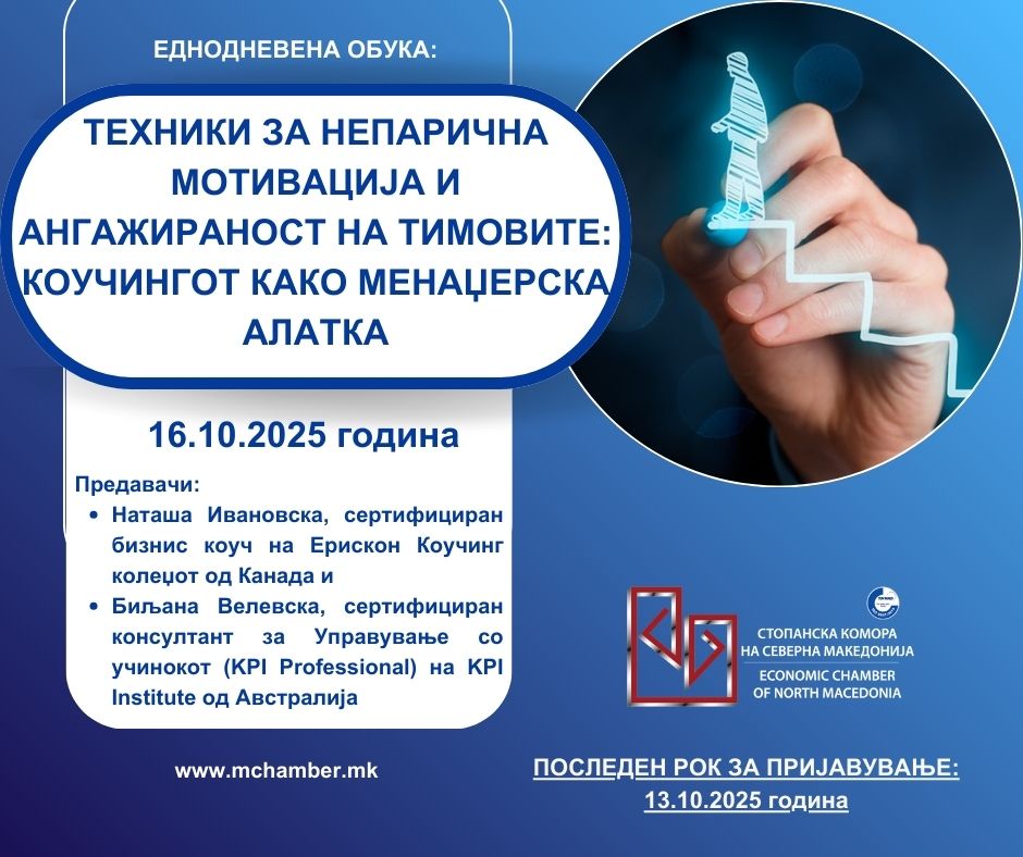 ТЕХНИКИ ЗА НЕПАРИЧНА МОТИВАЦИЈА И АНГАЖИРАНОСТ НА ТИМОВИТЕ: КОУЧИНГОТ КАКО МЕНАЏЕРСКА АЛАТКА – 16.10.2025 година
