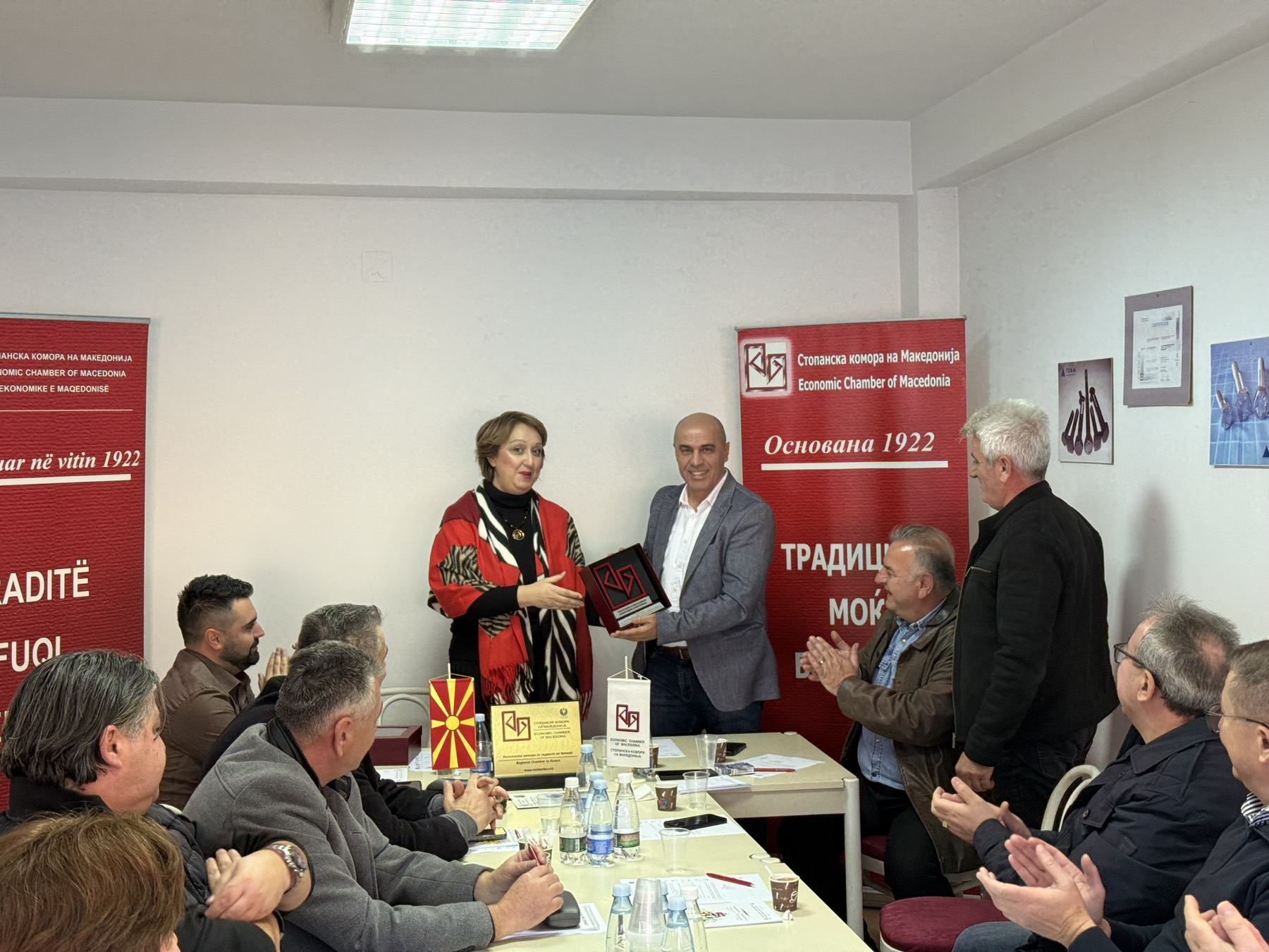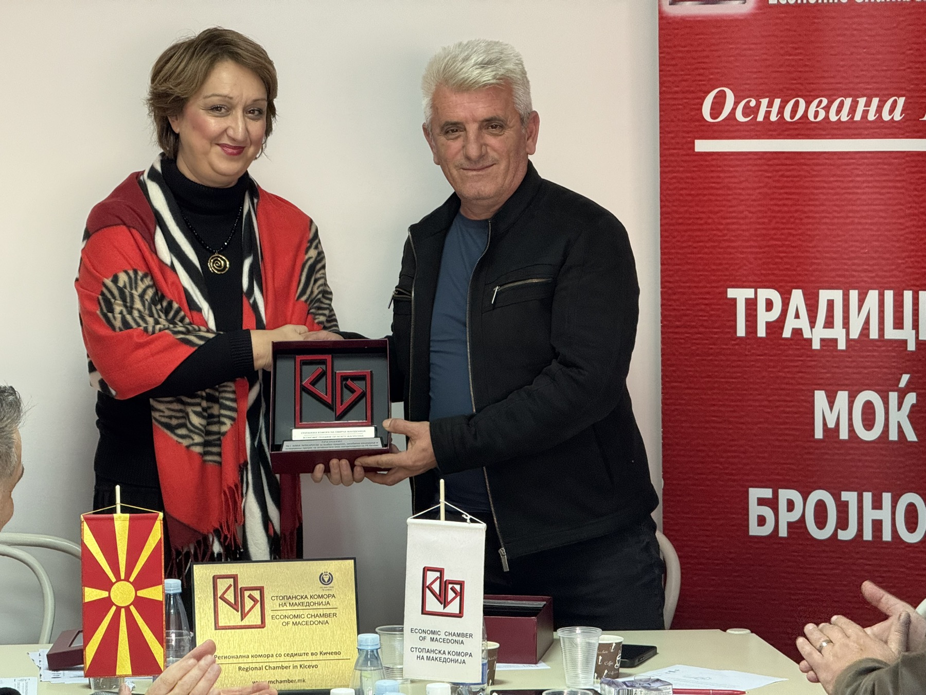 Д-р Георгиева Јовевска во свое, во име на Стопанската комора како и во име на претседателот на Стопанската комора на Северна Македонија, Бранко Азески им врачи Признанија за особен придонес, несебично вложување и остварување прогрес на активностите во работата на РК Кичево на досегашниот претседател на РК Кичево Игор Соколески како и на потпретседателот на РК Кичево Алија Зулбеароски.